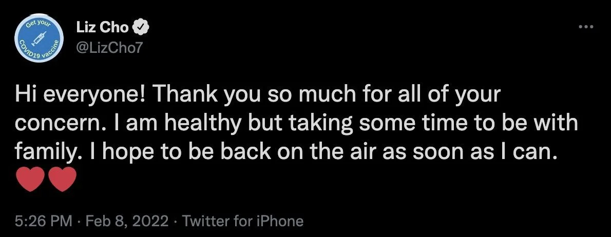 /Back in early February, FTVLive told you that WABC Anchor Liz Cho had been missing from the newscasts at the ABC O&O.