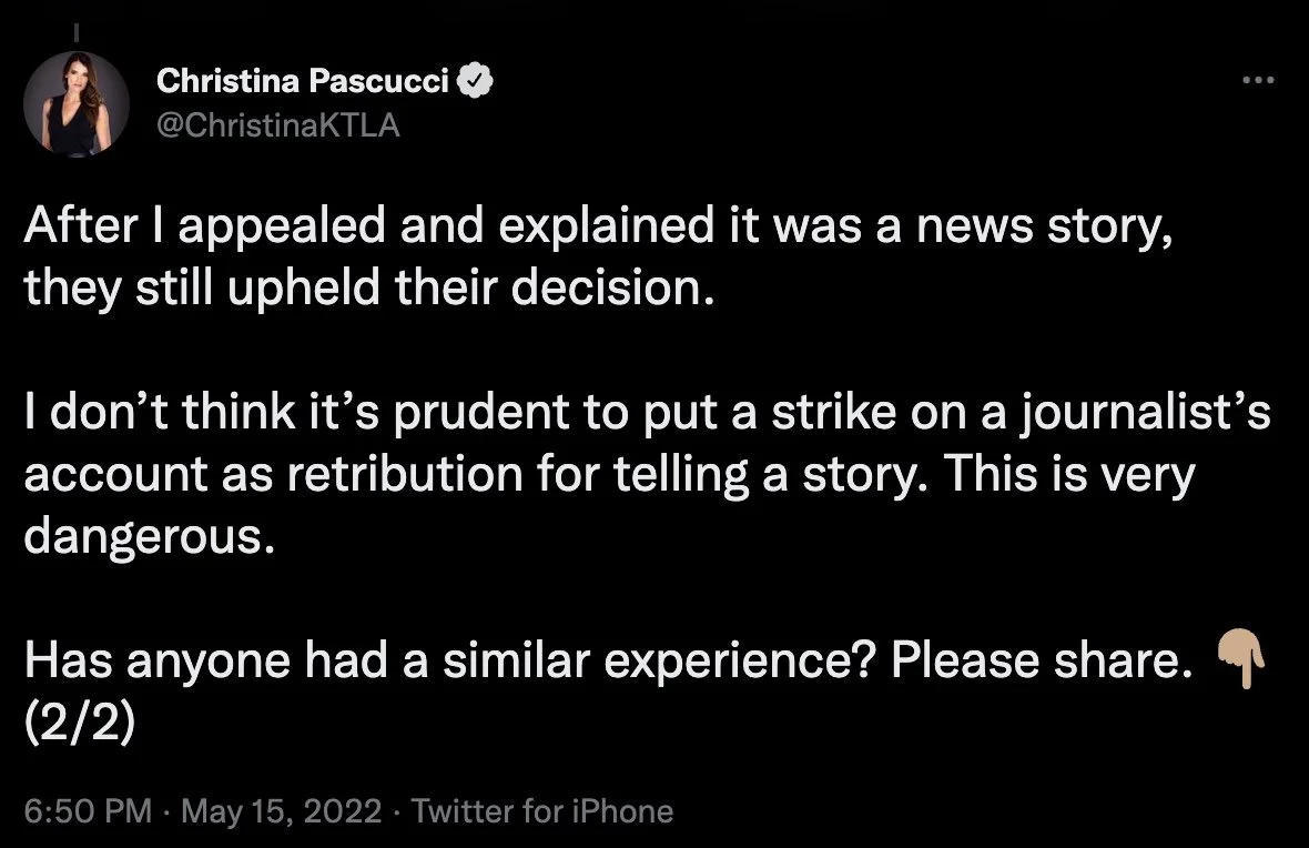 KTLA (Los Angeles) Reporter Christina Pascucci did a story on the far-right group QAnon and posted it to YouTube. It was long before YouTube pulled the story, gave her a strike, and suspended her from YouTube for a week.