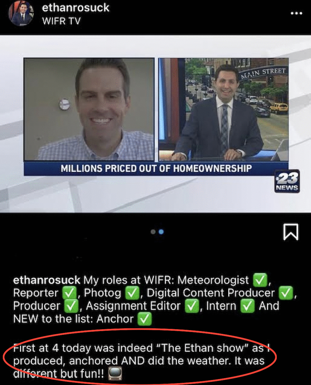 Over at Gray’s WIFR (Rockford) former intern, and now Meteorologist Ethan Rosuck was tapped with not only anchoring the newscast and doing the weather, but producing the show as well.