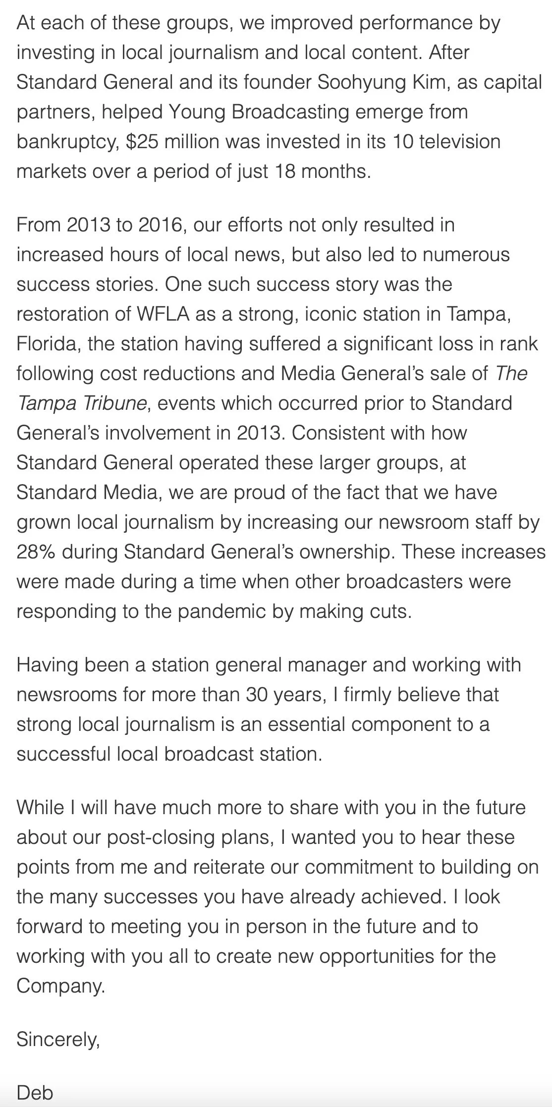 Standard General CEO Deb McDermott had Tegna send out a note to the staff in which she tries to pour cold water on the hot rumors.