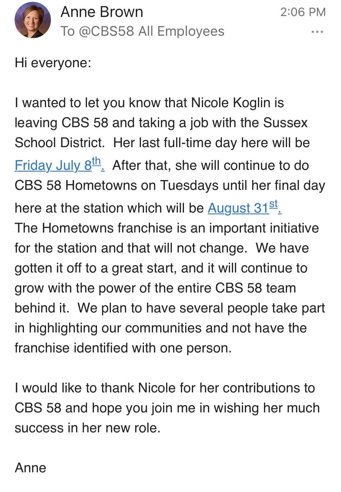 /When Nicole Koglin signed off from WITI ((Milwaukee) back in 202 she said that it was because "It's now time for me now to be with my own family when they wake up and start their day," Koglin said.