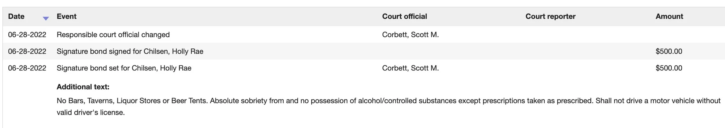 Court records say that she was released on two signature bonds for $500 a piece. It also says that as her case winds through the court system, she is to refrain from “Bars, Taverns, Liquor Stores or Beer Tents. Absolute sobriety from and no possession of alcohol/controlled substances except prescriptions taken as prescribed. Shall not drive a motor vehicle without valid driver's license.”