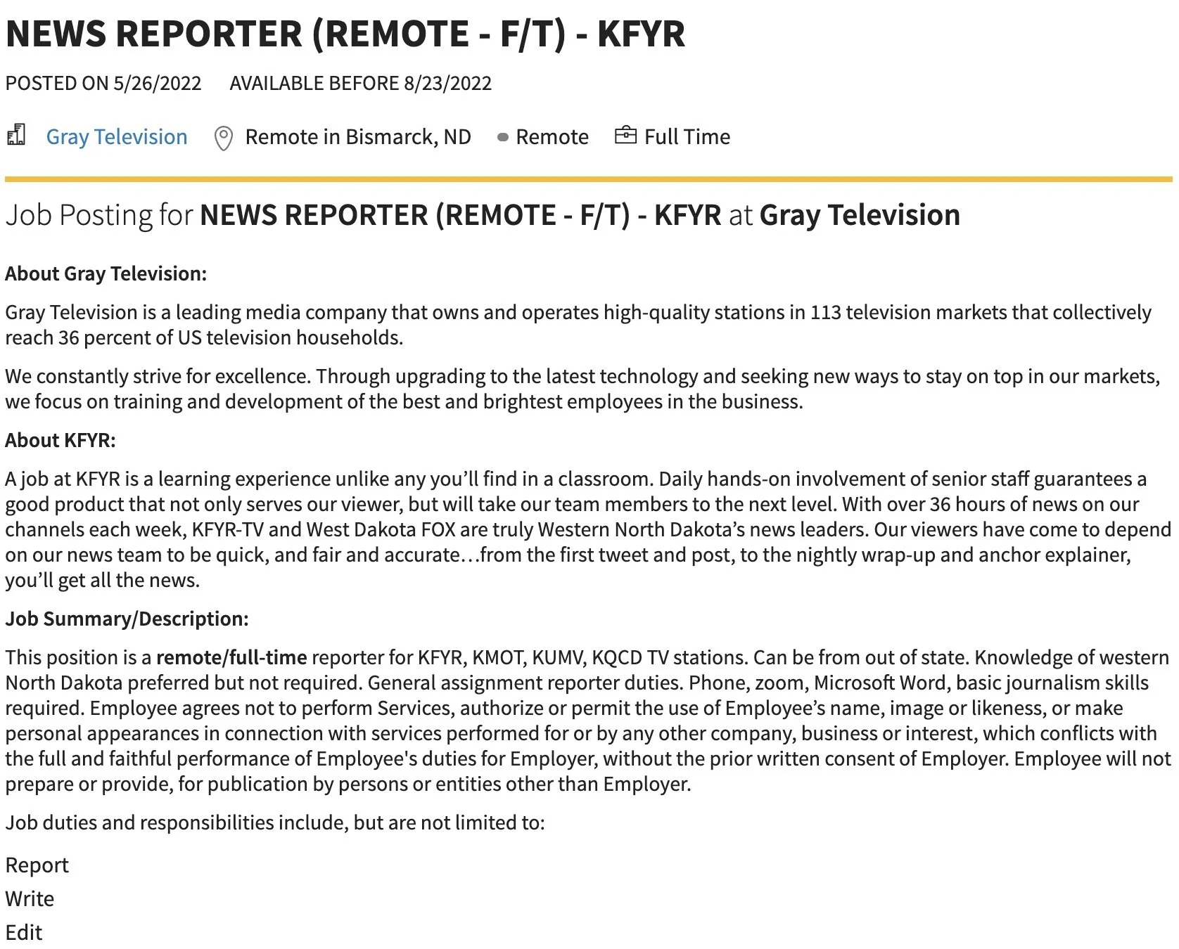 The job posting is for a Reporter job at Gray’s KFYR in Bismarck, North Dakota, but if you take the job, you don’t have to ever live in Bismarck. In fact, you don’t have to live anywhere in North Dakota.