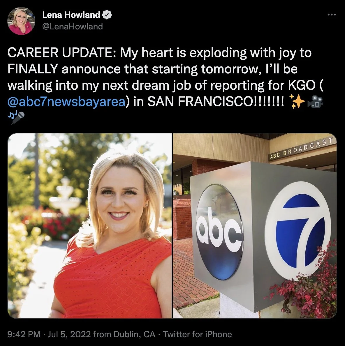 Lena Howland was working at the Tegna station in Sacramento and then landed a job at ABC O&O KGO in San Francisco.