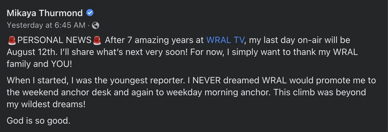 /WRAL Anchor Mikaya Thurmond announced that she is leaving the the top rated station after 7 years.