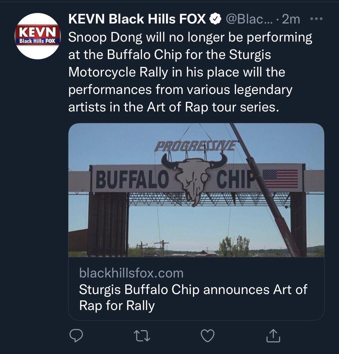 /according to Gray’s KVEN (Rapid City), there is a big change in the musical guests at the Sturgis Motorcycle Rally in South Dakota.