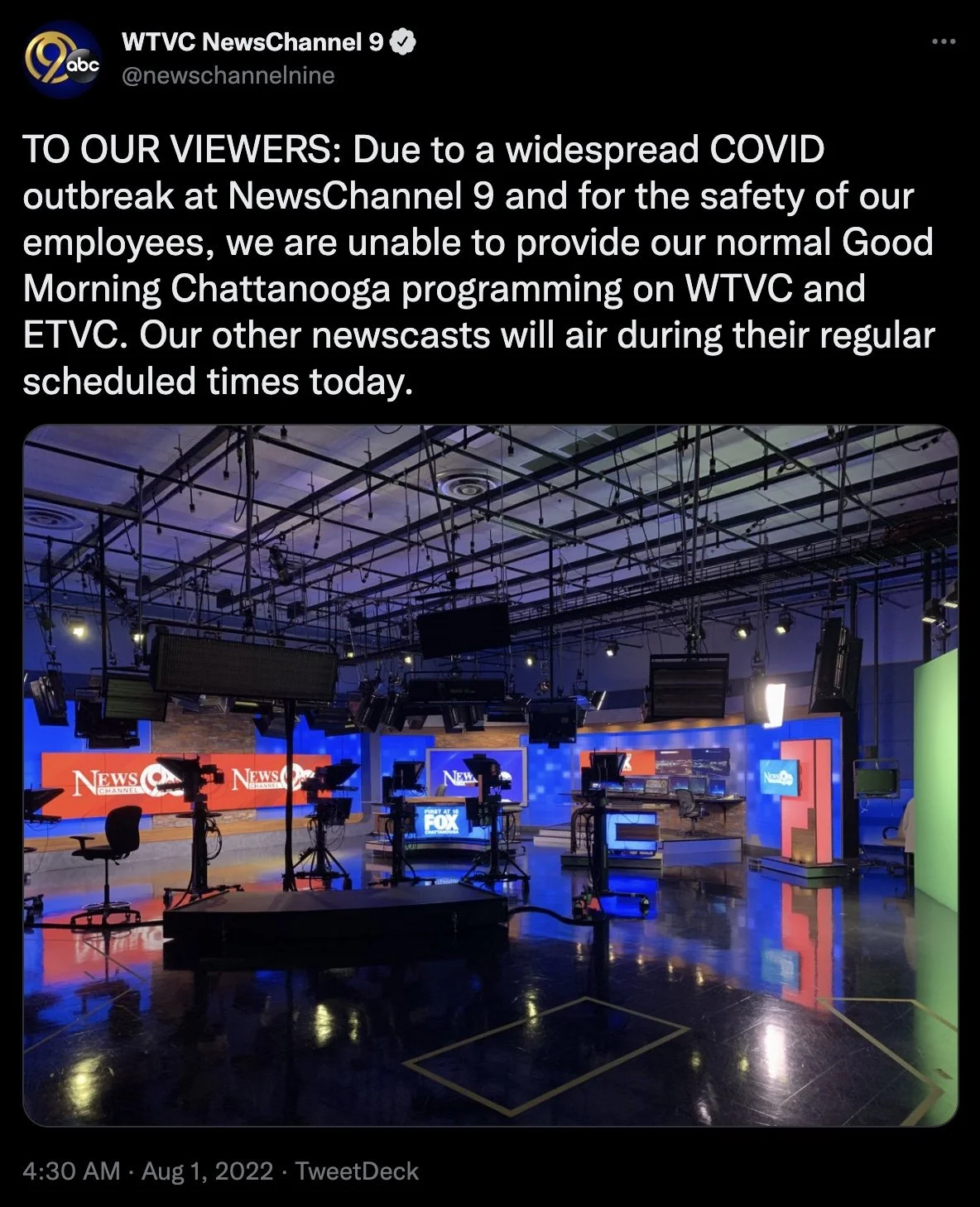 /Sinclair owned WTVC (Chattanooga) cancelled their morning newscast after they said the station has experienced a “widespread” COVID outbreak.