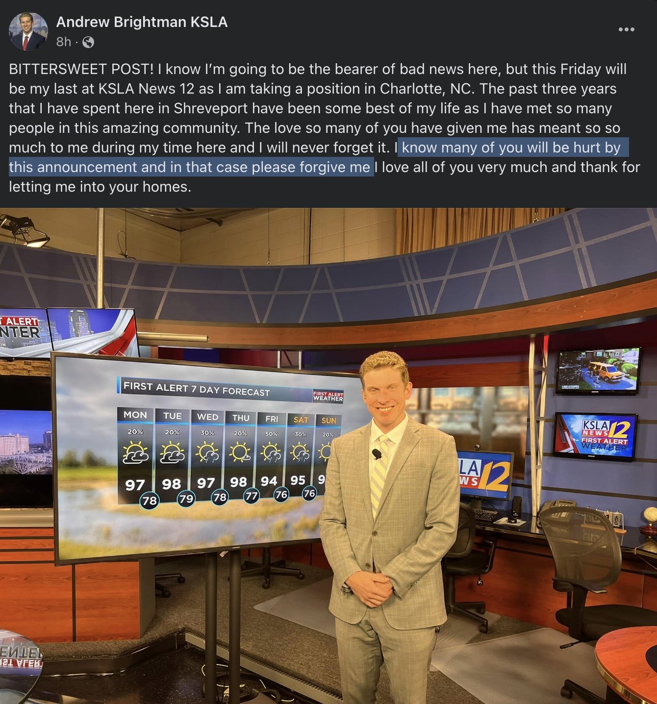 Andrew Brightman has been a Weather Anchor at Gray’s KSLA (Shreveport) for the past 3 years. Like many people that stop by the small market of Shreveport, Brightman is moving onto a bigger market.