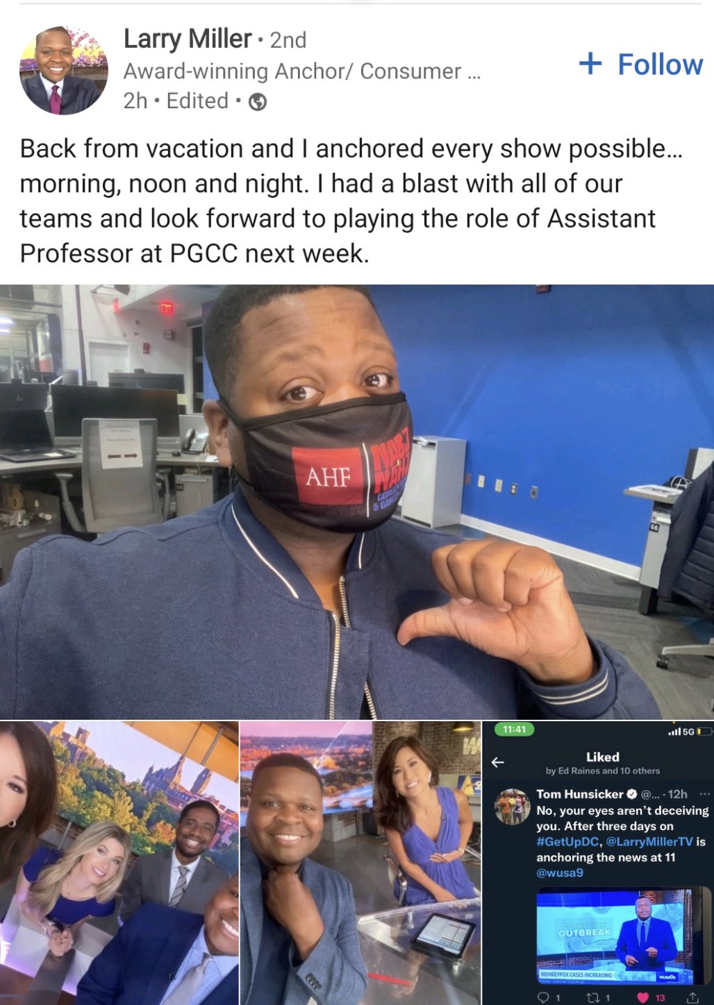 It seems that Tegna’s WUSA (DC) has no male Anchors on staff and Larry Miller has been tasked with “anchoring every show possible) after getting back from vacation.