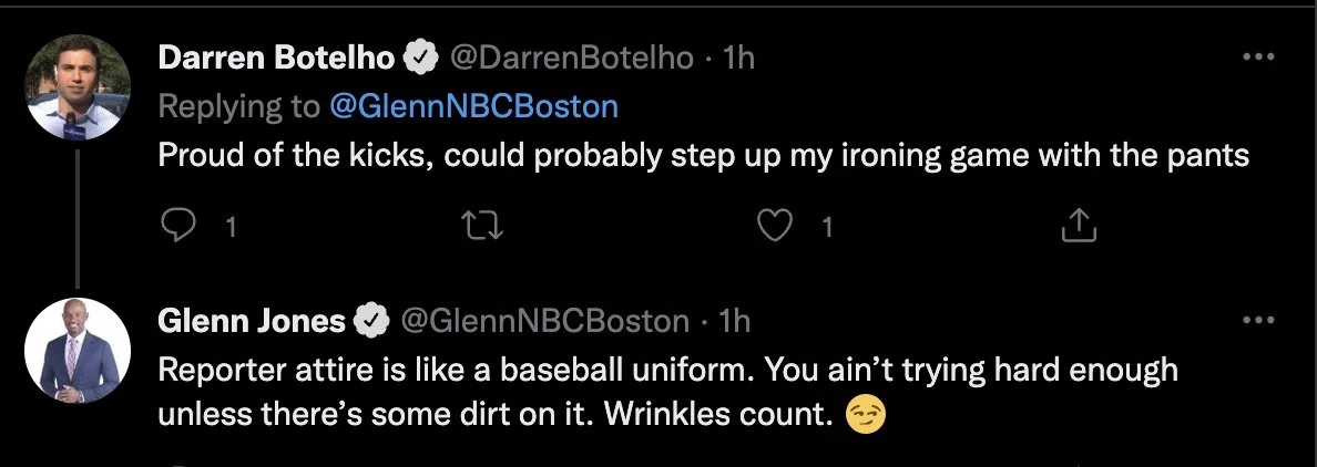 NBC 10 (Boston) Anchor Glenn Jones sends out this post, showing Reporter Darren Botelho and his “fly sneaks.” Jones does add that Botelho is reporting on a “heartbreaking story” that we hear involves the death of one person and another person is missing.