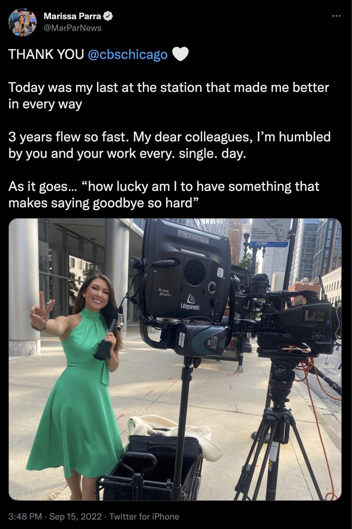 WBBM Anchor/Reporter Marissa Parra has wrapped up her time at the CBS O&O in Chi-town.
