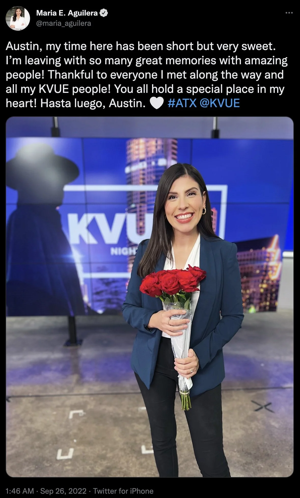 /Maria Aguilera joined Tegna’s KVUE back in December of last year, it appears she won’t be making it to December of this year.
