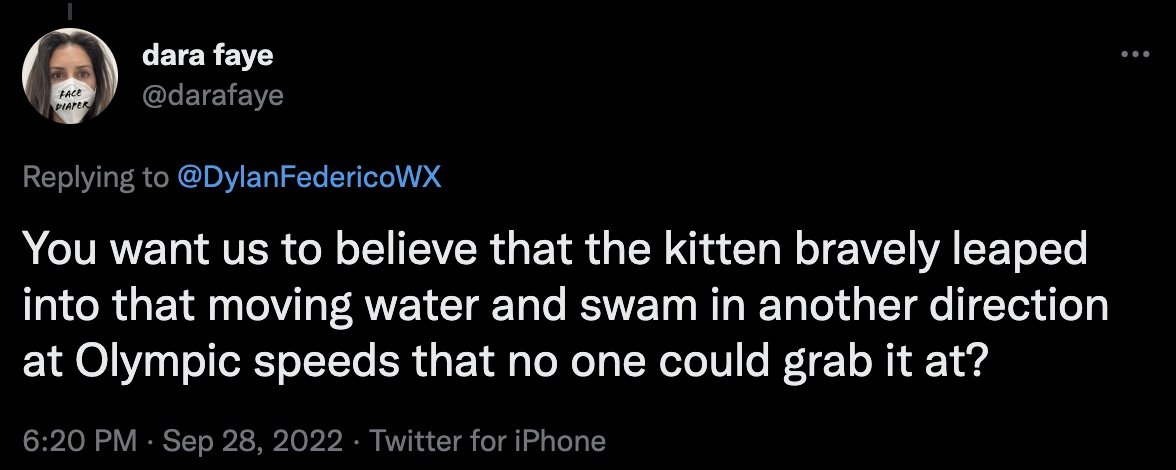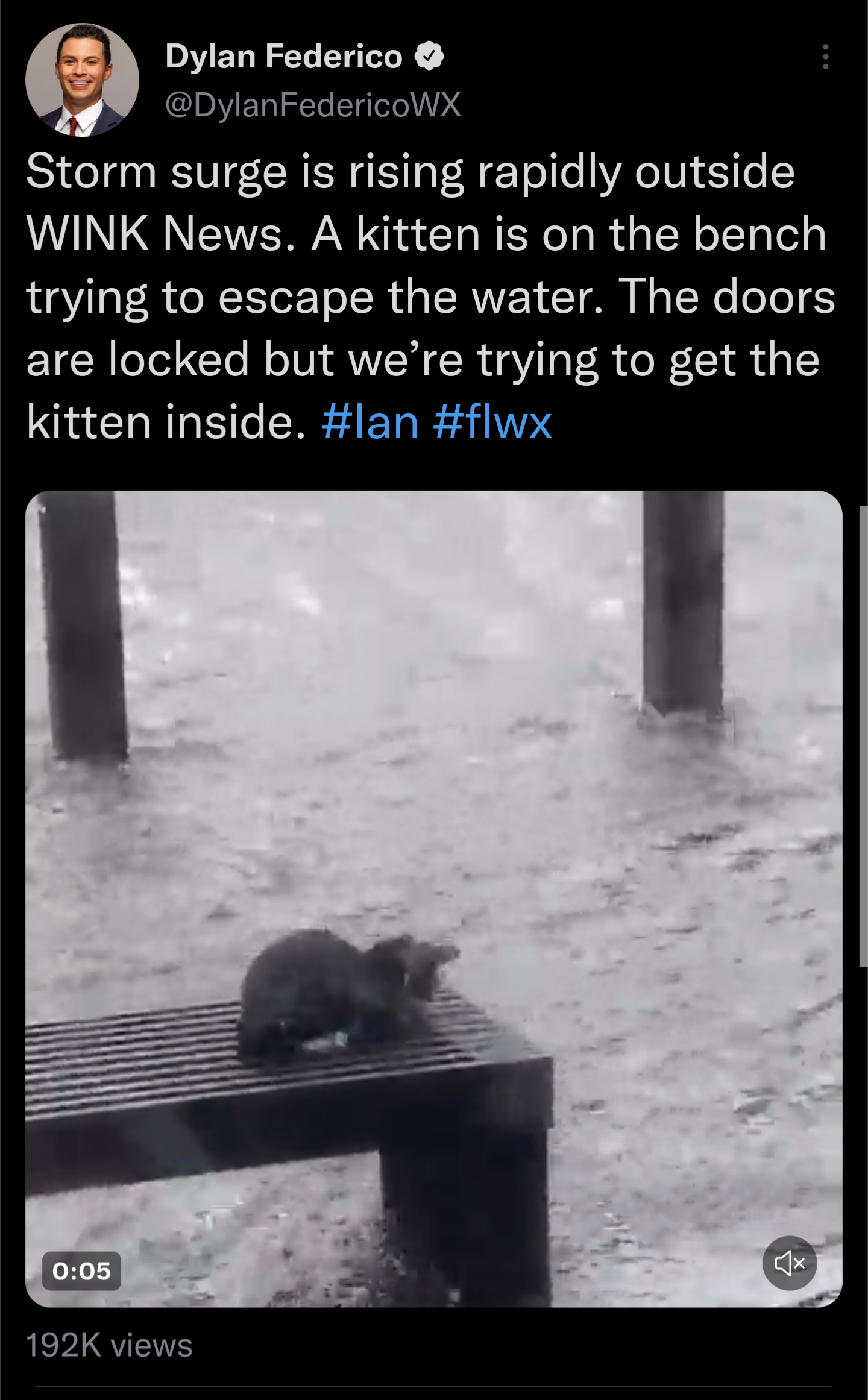 Weatherman Dylan Federico used the downtime of not being on air to post a video of a kitten stranded in the hurricane.