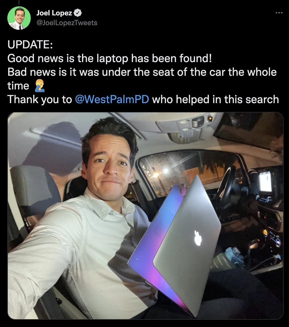 Well, it turns out he didn’t do that, but the West Palm Beach Police did and they found the laptop, right under Joel’s sit in the car.