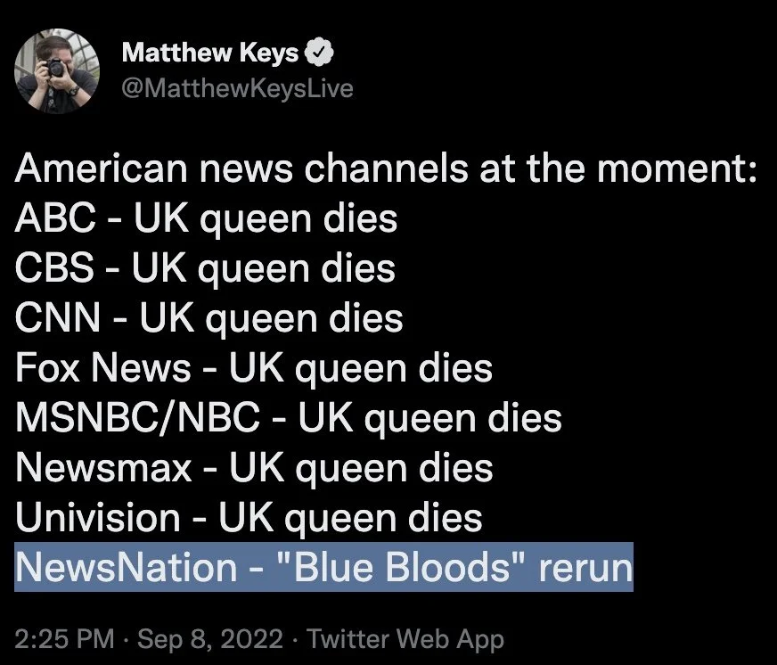 /As the news filtered down that the Queen of England had passed away, most news networks tossed regular programming to focus on the news from across the pond.