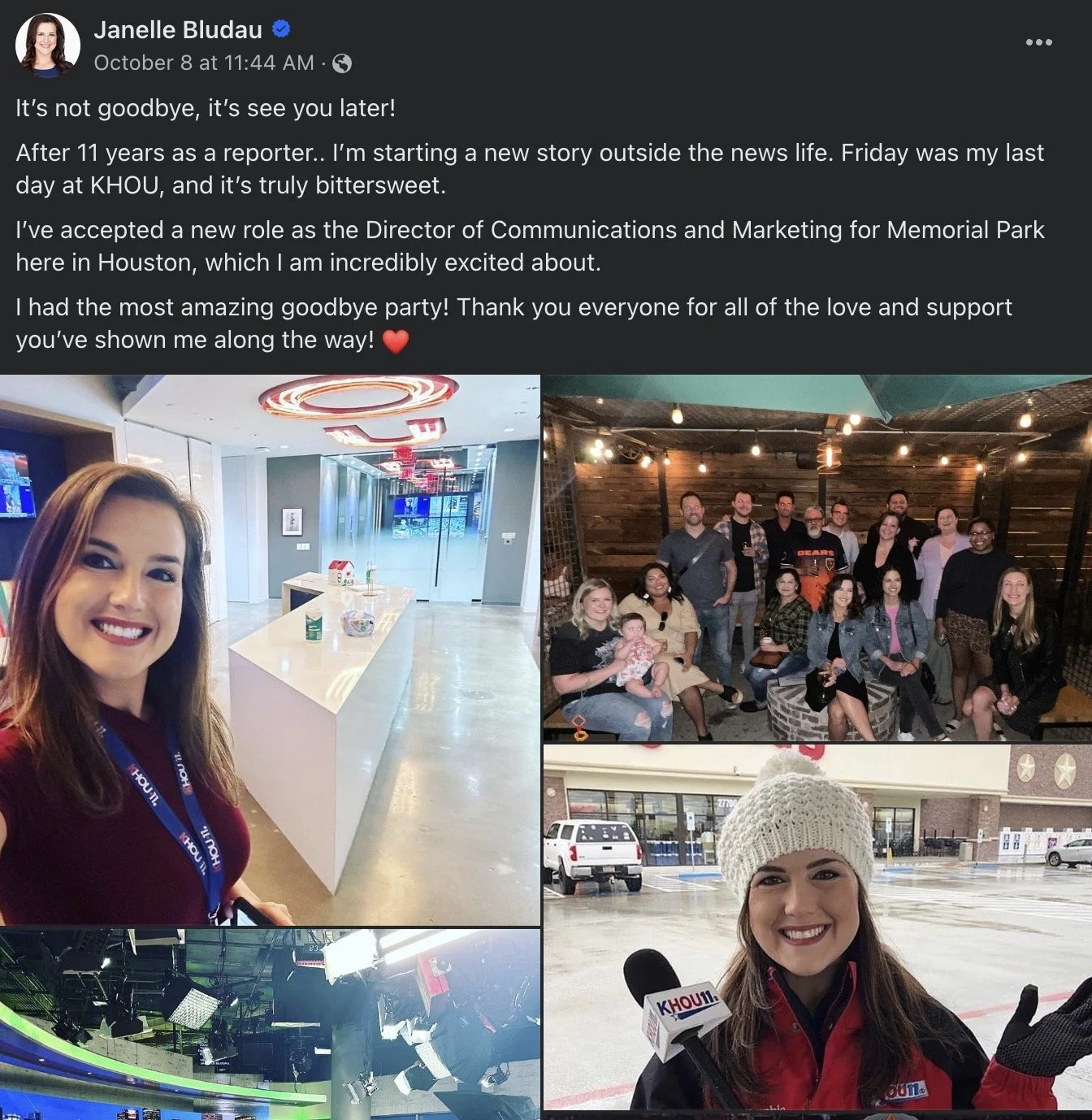 KHOU (Houston) Reporter Janelle Bludau has left the Tegna station and the TV news business altogether.
