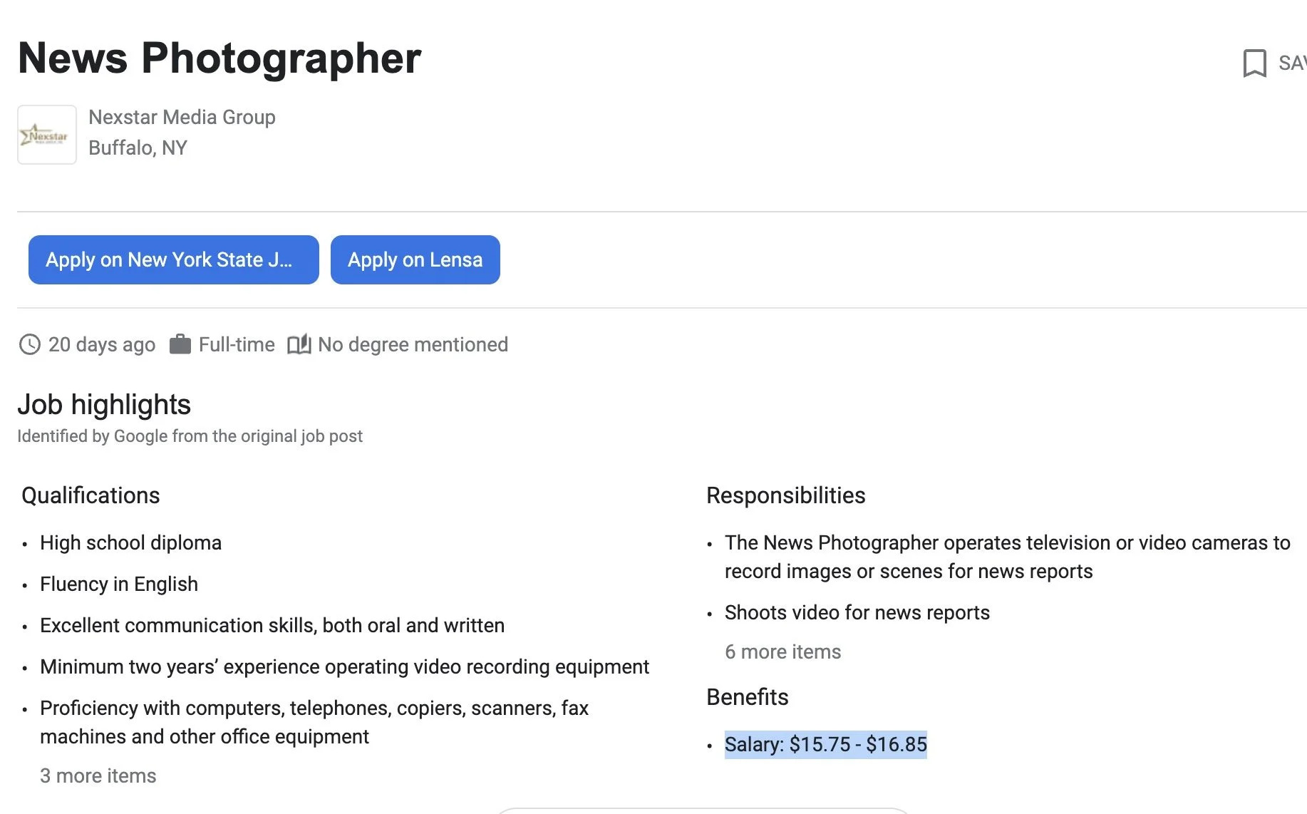 This is a Photographer job at Nexstar’s WIVB in Buffalo. They did post salary information, and the pay starts at $15.75 and hour.