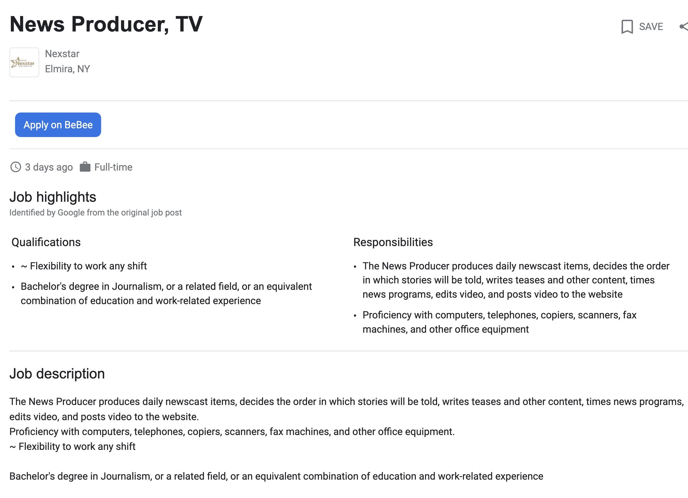 This job was posted just 3 days ago. The last time the station posted a Producer job it paid just $15 bucks and hour, or less than you would make at McDonald’s.