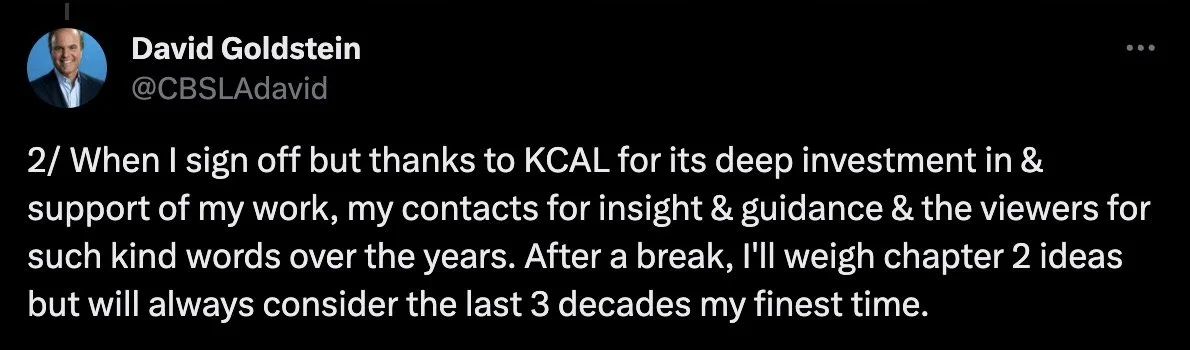 /After more than 3 decades, KCBS/KCAL Investigative Reporter David Goldstein says that he is signing off from the CBS O&O.