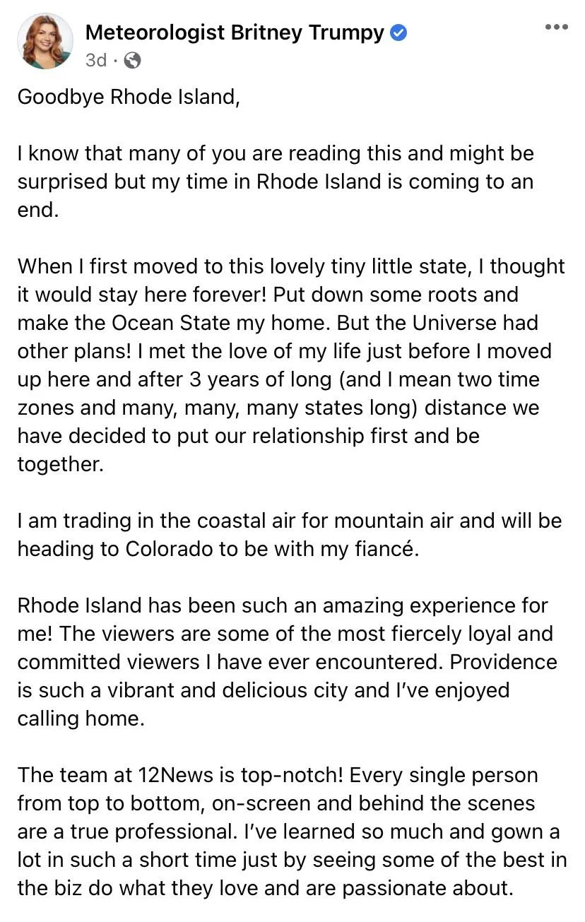 Weekend morning meteorologist Britney Trumpy is leaving the station. This is just days after morning meteorologist Michelle Muscatello announced she is leaving.