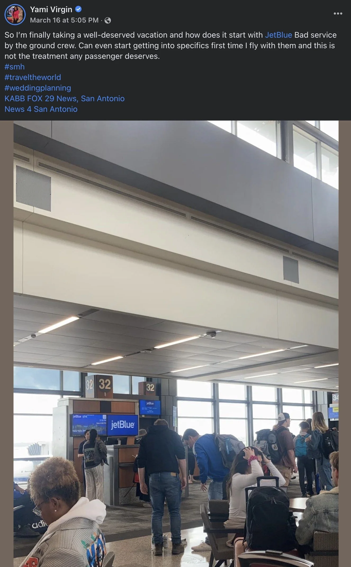 KABB (San Antonio) Reporter Yami Virgin decided to use her station-branded account to bitch about the ground crew at Jet Blue Airlines.