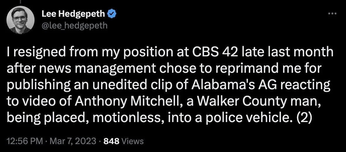 He resigned his position after he said that management at the station reprimanded him for publishing an unedited clip of Alabama's AG reacting to video of Anthony Mitchell, a Walker County man, being placed, motionless, into a police vehicle.