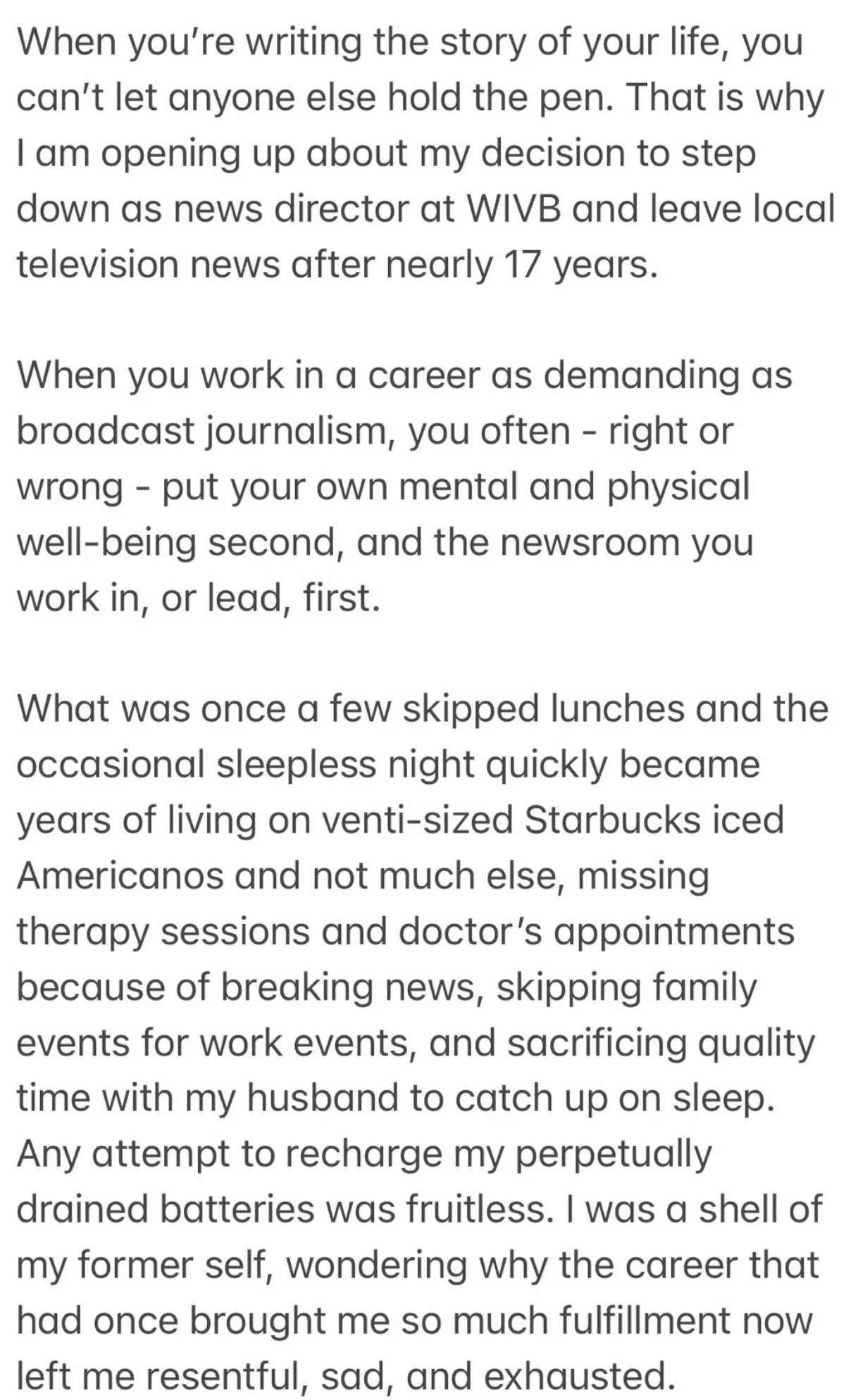 She said that the job she once loved had left her, “resentful, sad, and exhausted.”