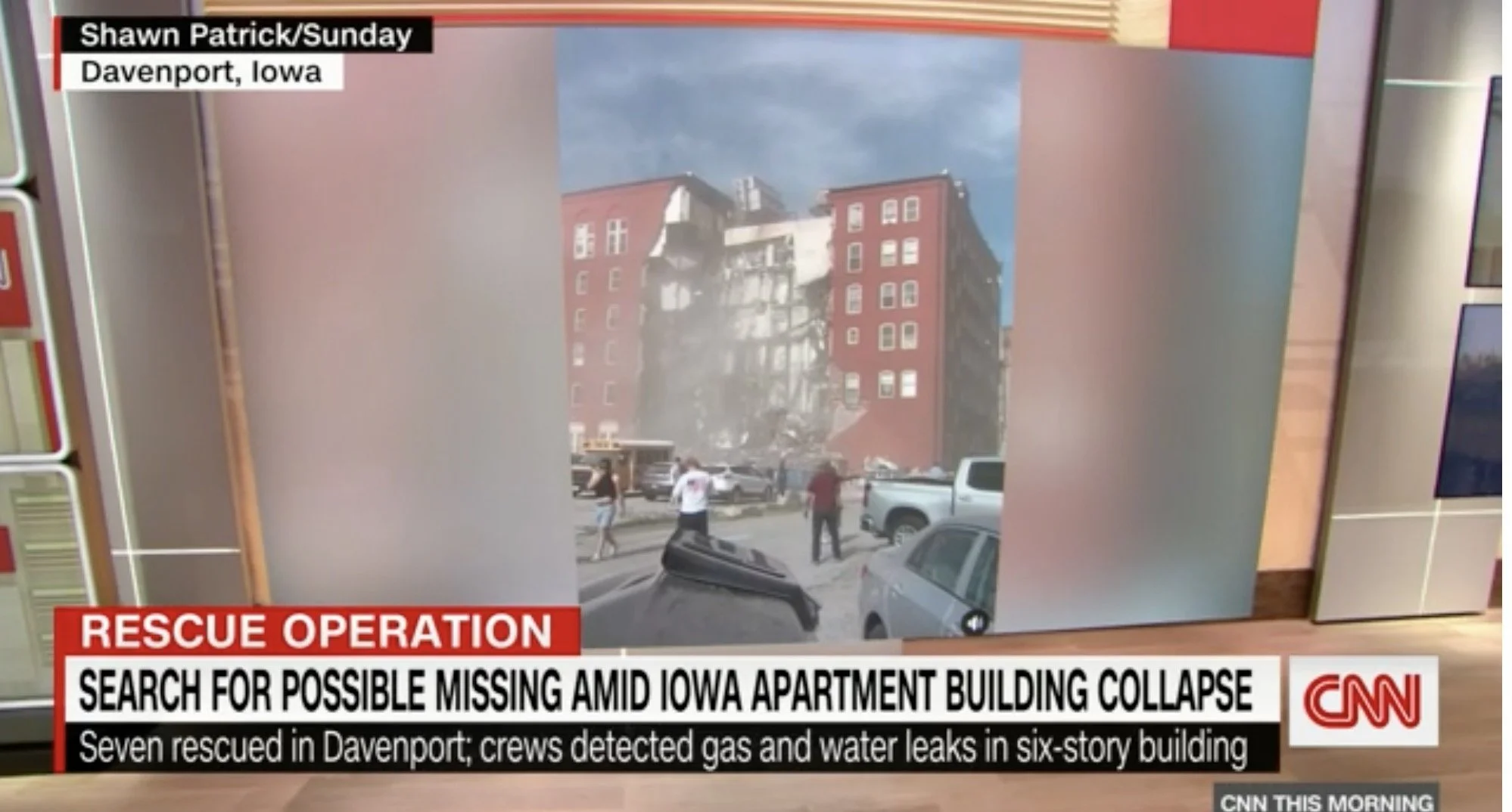 “In regards to your story about Iowa stations dropping the ball about the building collapse- yes, most certainly did. In watching KWQC’s 5 pm newscast yesterday, they had all of four minutes of coverage then it was first weather, then a commercial break. All of two reporters on it - just one was live at the scene. Contrast that with KCCI who made the two-and-a-half hour drive to Davenport and brought their drone with them and turned an entire PKG on it and had a live reporter - at the scene and another in studio. I get it the Quad Cities is not the biggest and certainly not the sexiest market but this is a huge story just like when the building collapsed in Florida and should have been treated as such.”