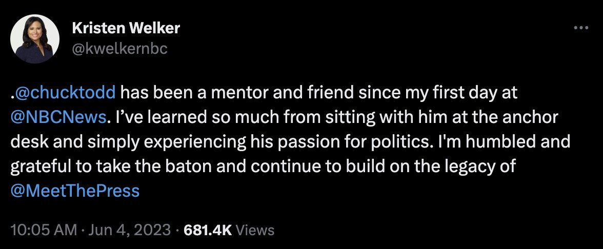 NBC has announced that Kristen Welker will be taking over Meet the Press from Chuck Todd later this Summer.