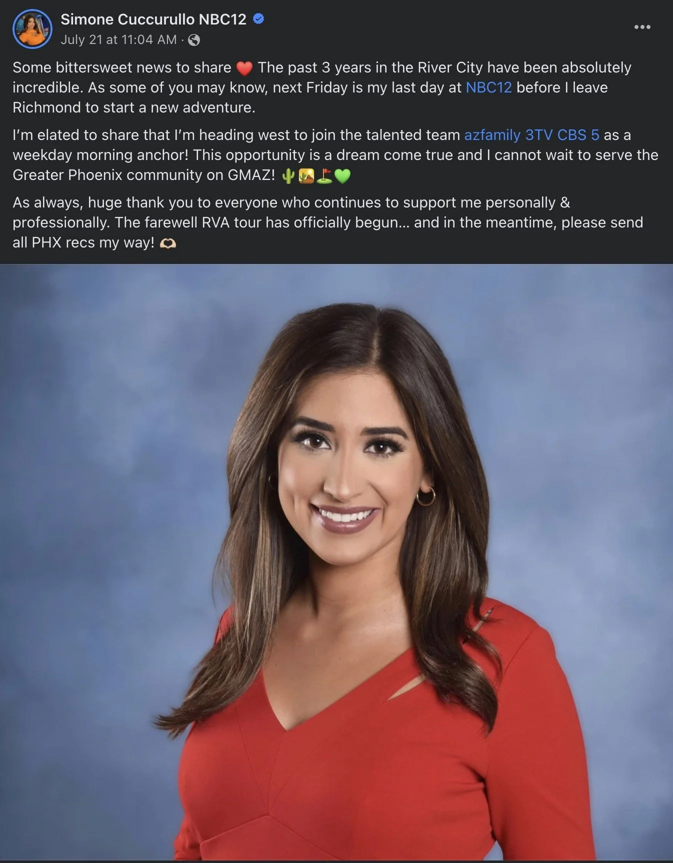 /WWBT (Richmond) Anchor Simone Cuccurullo is leaving the station later this week after 3 years.