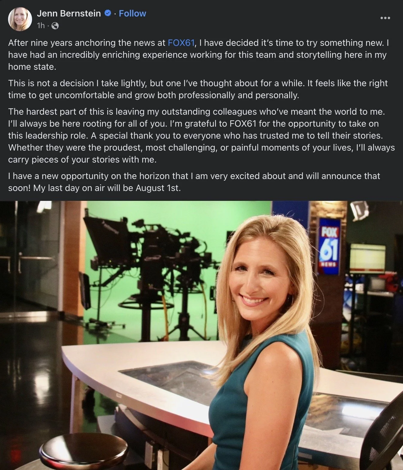 /After almost a decade of anchoring the news at WTIC (Hartford), main Anchor Jenn Bernstein says she’s ready to try something new.