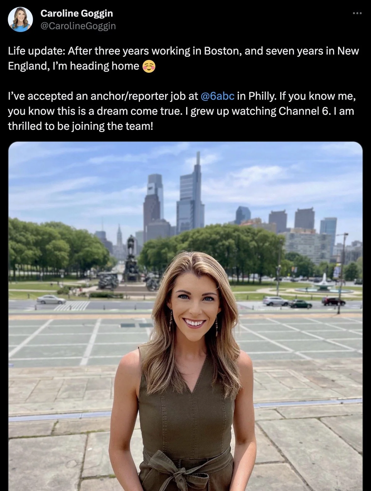 /WHDH (Boston) Reporter Caroline Goggin announced that she is headed to WPVI in her hometown of Philly.