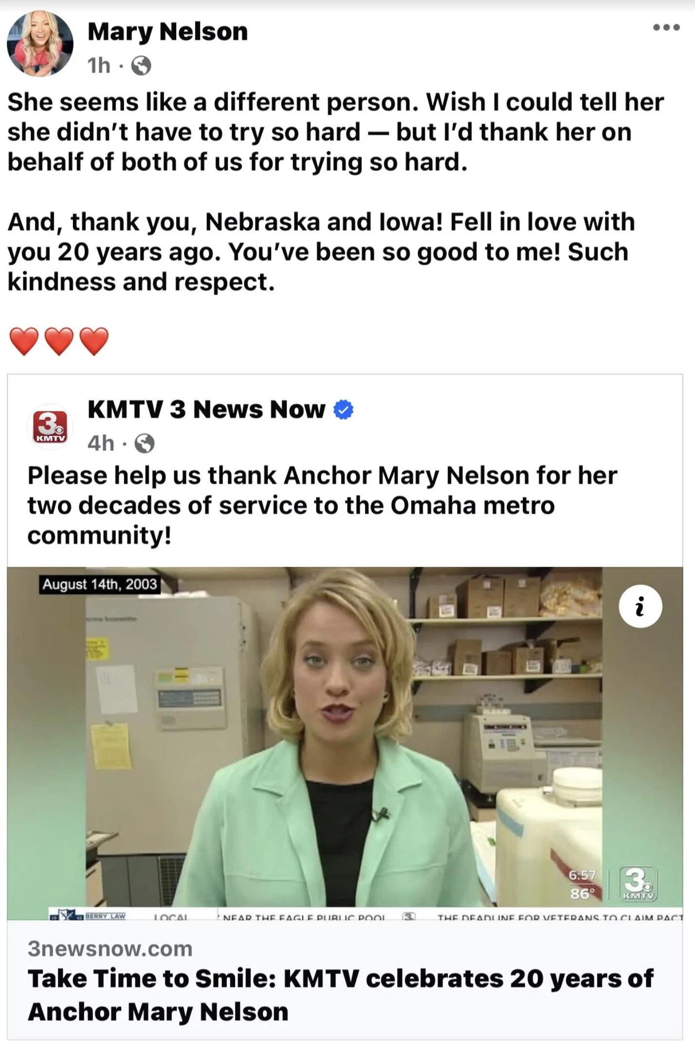 /KMTV (Omaha) ran a sponsored segment on the newscast to pay tribute to their Anchor Mary Nelson for working at the station for 20 years.