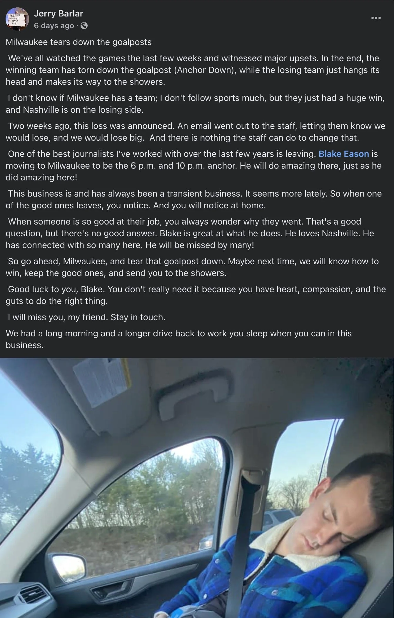 /WKRN (Nashville) Photographer Jerry Barlar made a Facebook post about one of the Reporters he works with.