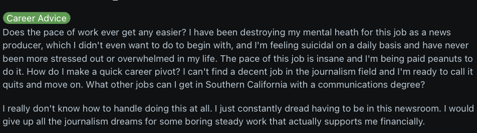 /This post is on Reddit from a newly hired Producer who is having problems dealing with the job.