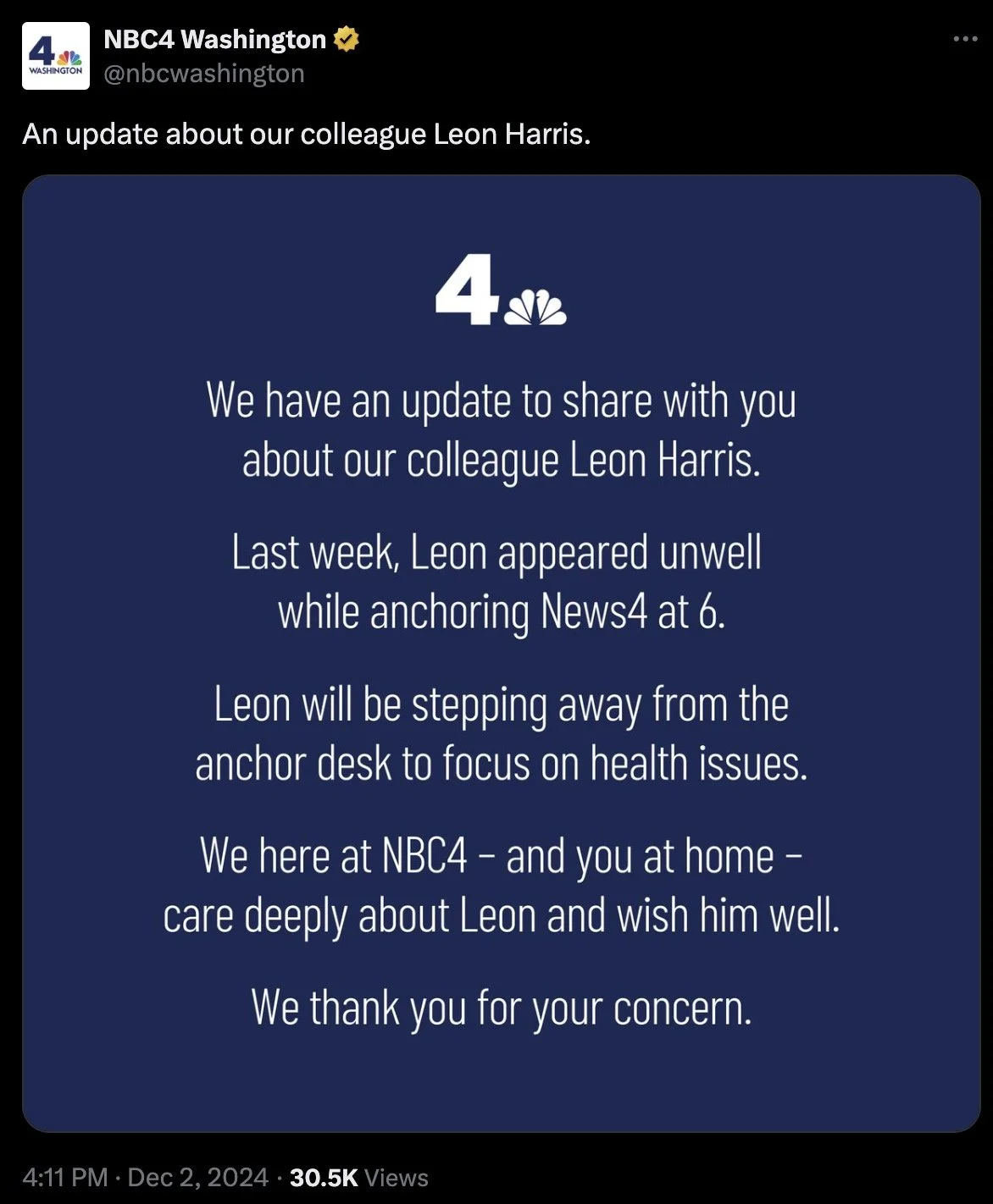 /Yesterday, FTVLive told you that NBC O&O, WRC in Washington, DC, had posted a message to social media, telling viewers that Anchor Leon Harris was off the air.