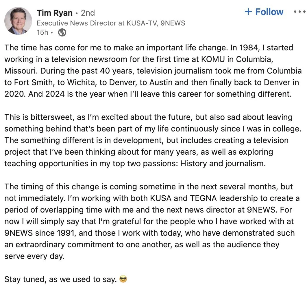 Four years into that job at the Tegna station and Ryan has announced that he’s leaving the station.