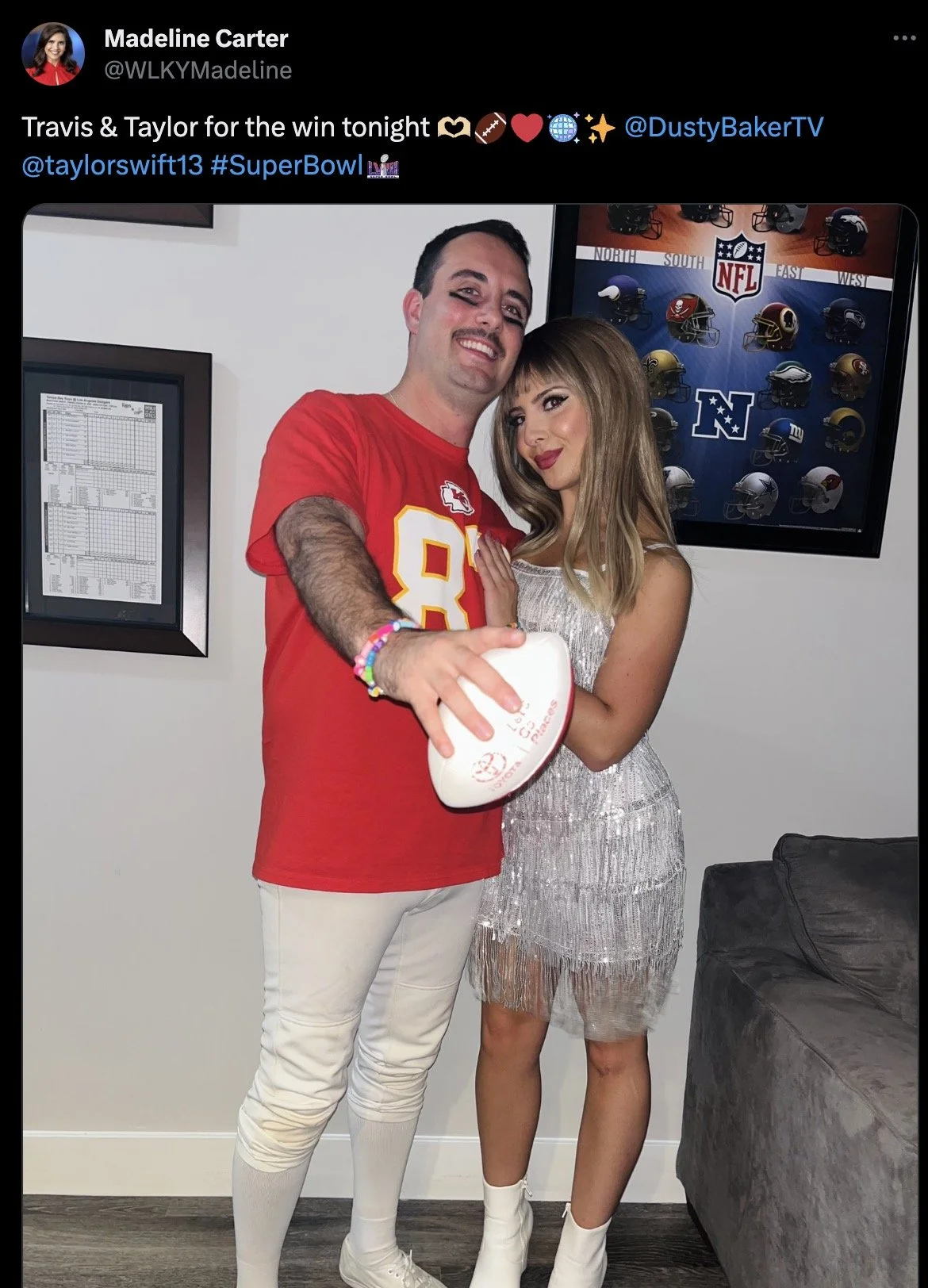 /WLKY (Louisville) Anchor Madeline Carter is dating WAVE (Louisville) Sports Anchor Dusty Baker, and the pair decided to play dress up on Super Bowl Sunday.