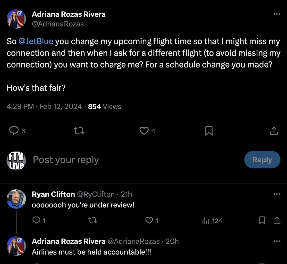/WPRI (Providence) Reporter Adriana Rozas Rivera went on her station-branded social media to bitch about JetBlue Airlines.