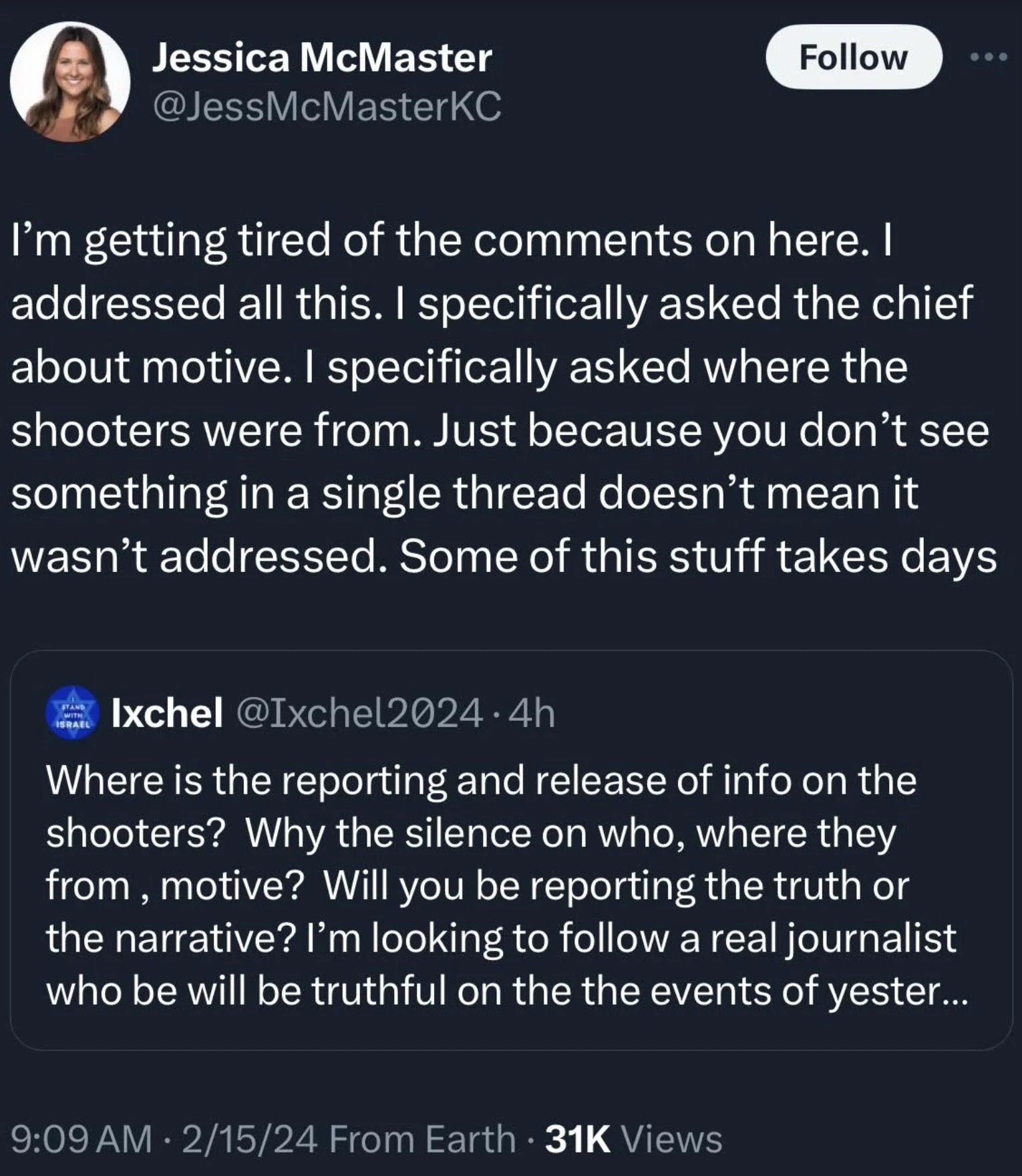 KSHB (Kansas City) Reporter Jessica McMaster responded to a Twitter troll who accused her of not doing her job.