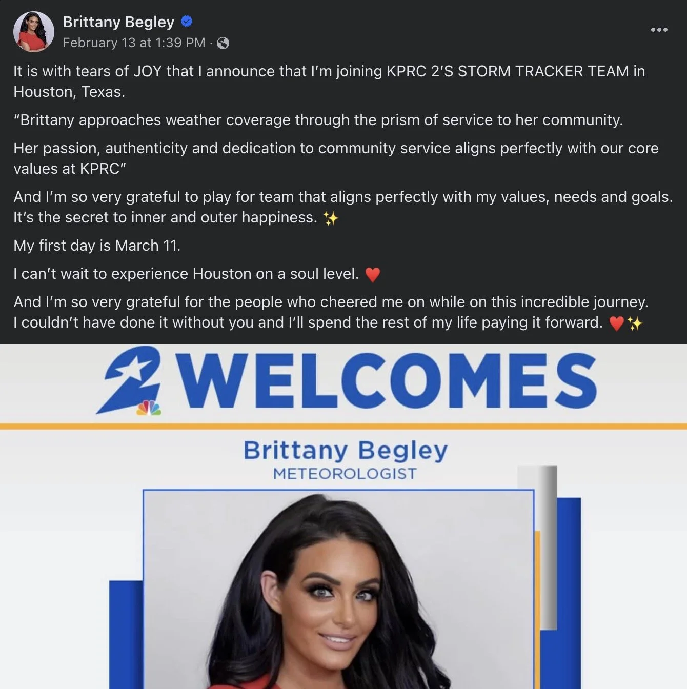 KPRC (Houston) announced that they have hired Brittany Begley as weekend morning meteorologist.