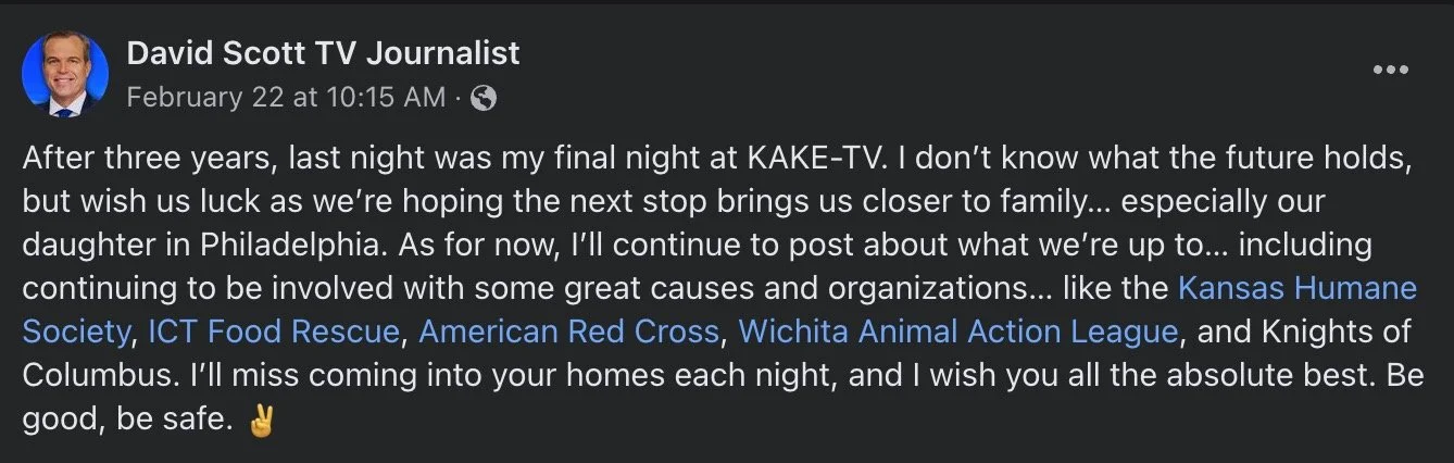 /It appears that KAKE (Wichita) has parted ways with Anchor David Scott.