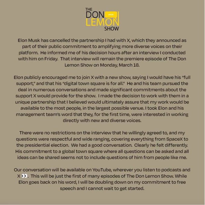After Don Lemon conducted his interview with Musk, Twitter (X) pulled the plug in supporting Lemon.