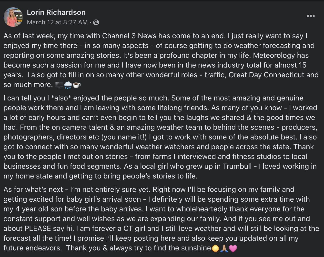 /Gray’s WFSB (Hartford) has parted ways with Meteorologist Lorin Richardson.