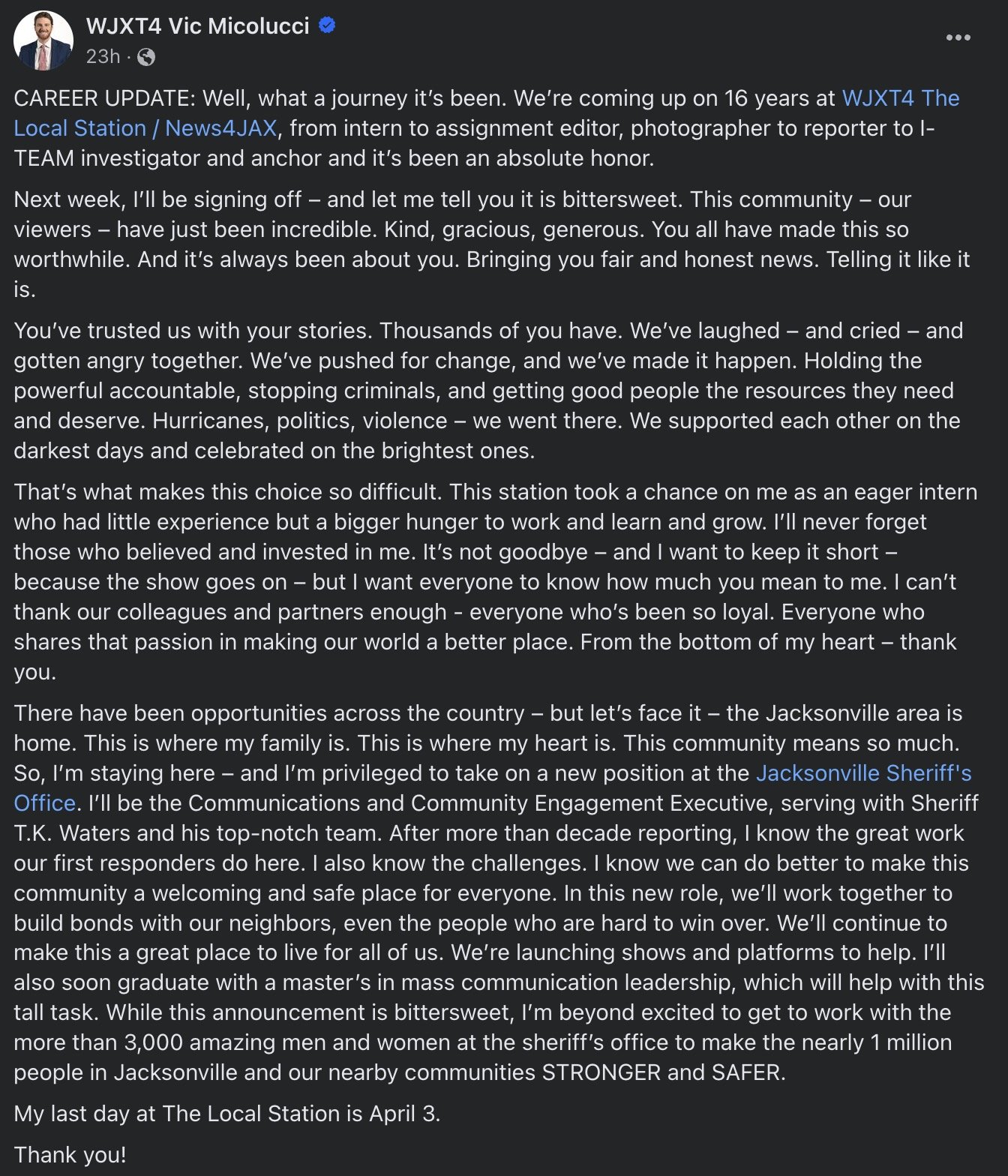 /WJXT Anchor/Reporter Vic Micolucci announced he is leaving the Graham Media station and the news business altogether.