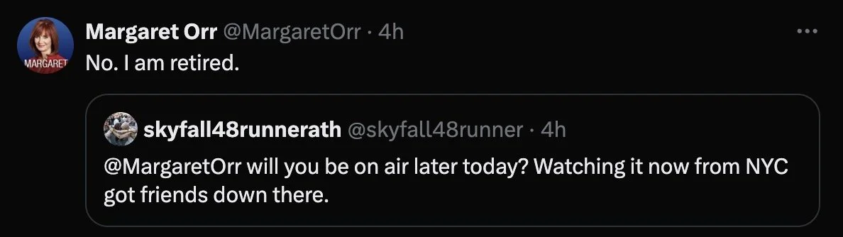 When one viewer asked if they would be seeing her on the air later, she replied back that she’s retired.