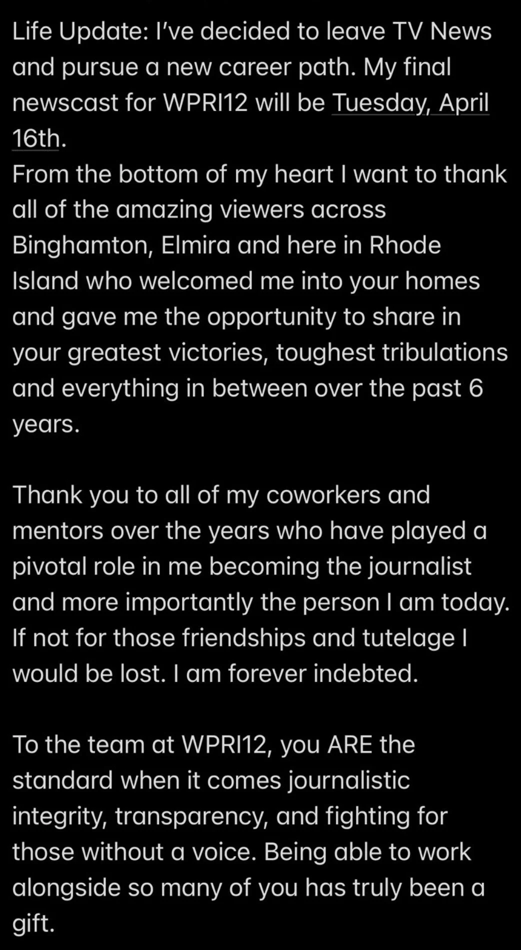 WPRI (Providence) Reporter Matt Paddock announced he has a few days left, before he leaves the station and the TV business as a whole.