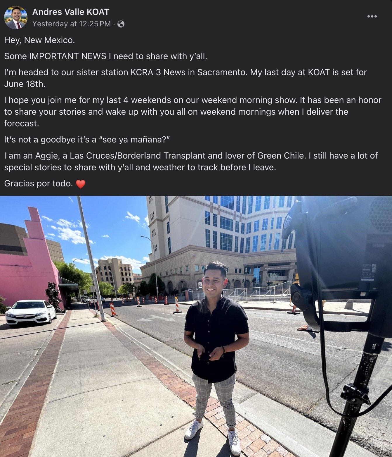 /KOAT (Albuquerque) Weather Forecaster and Reporter Andres Valle is leaving the station, but is staying in the Hearst food chain.