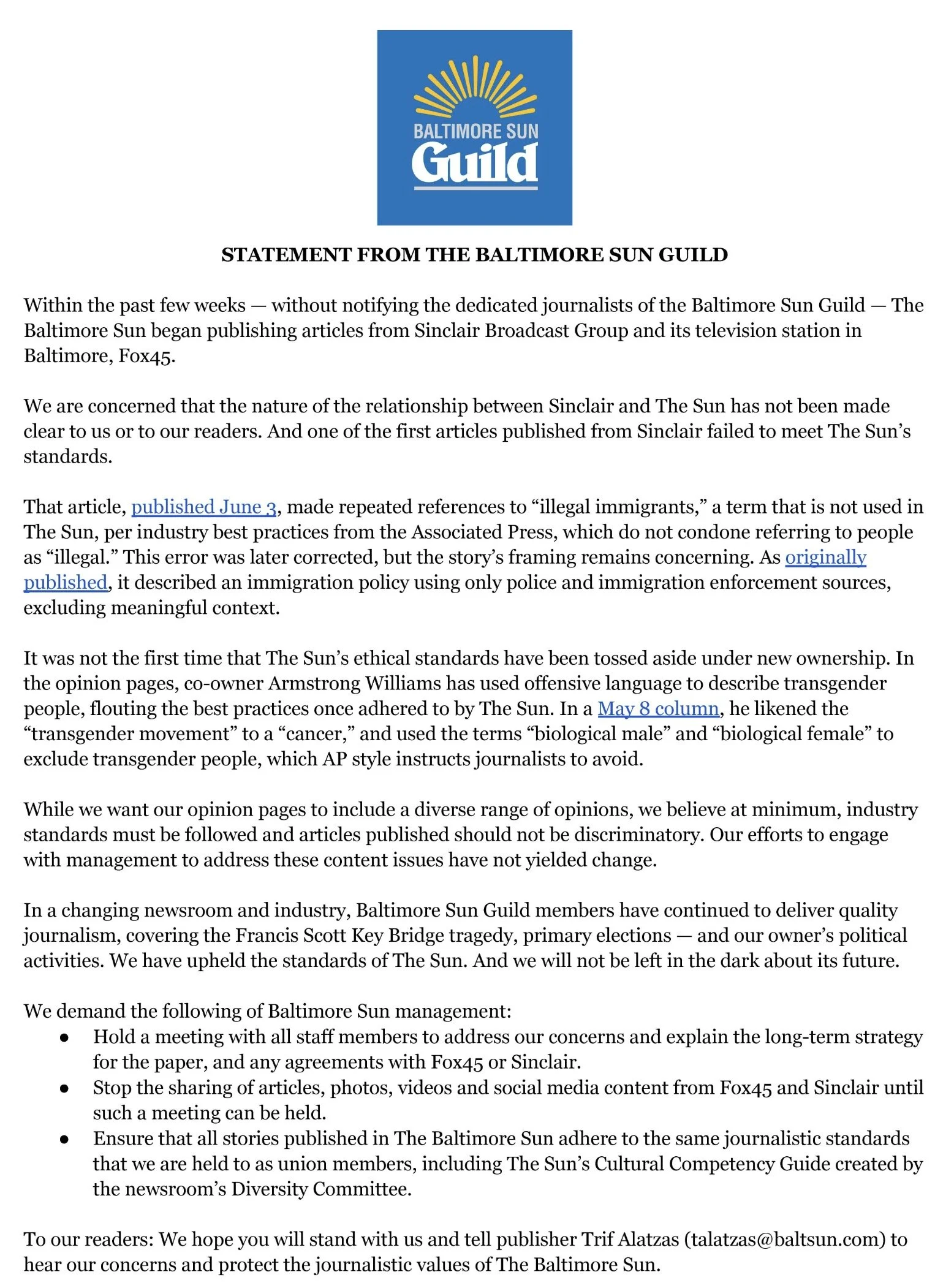 The Baltimore Sun Guild is demanding that the paper stop publishing articles, videos, photos, and social media content from WBFF and other Sinclair stations.