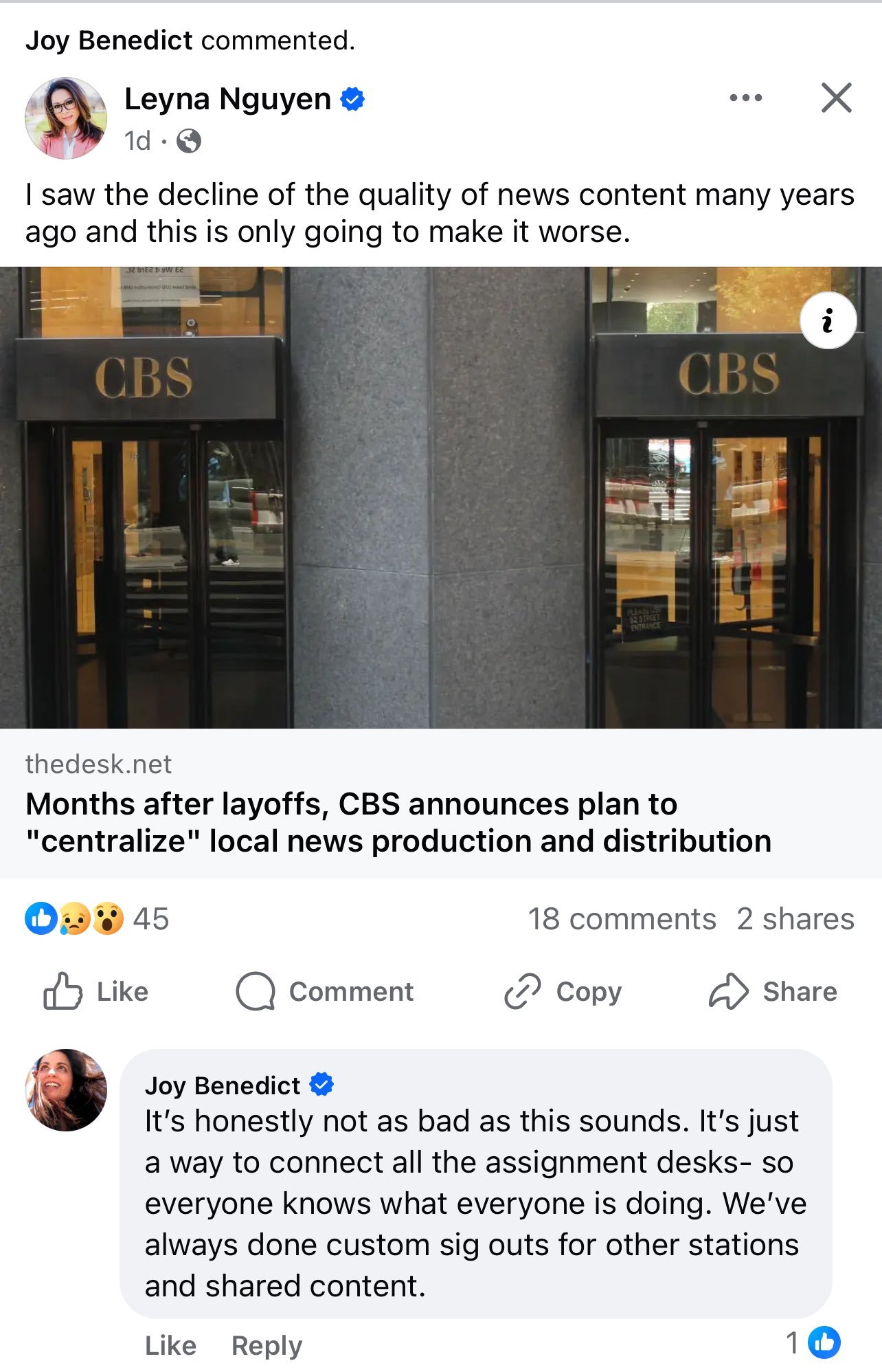 /As CBS announced that they are going to "centralize" local news production, some see it as nothing more than yet another cost cutting move.